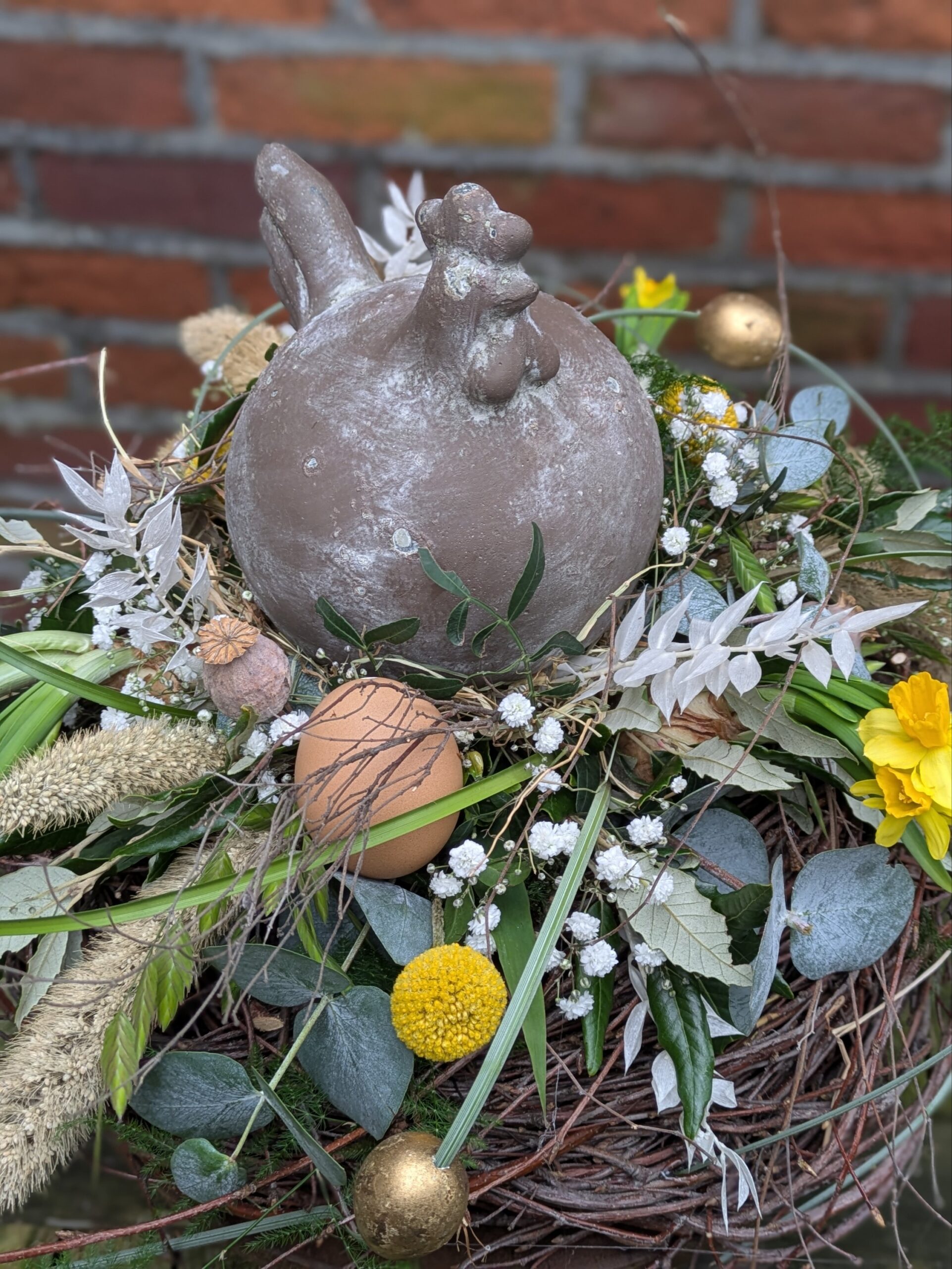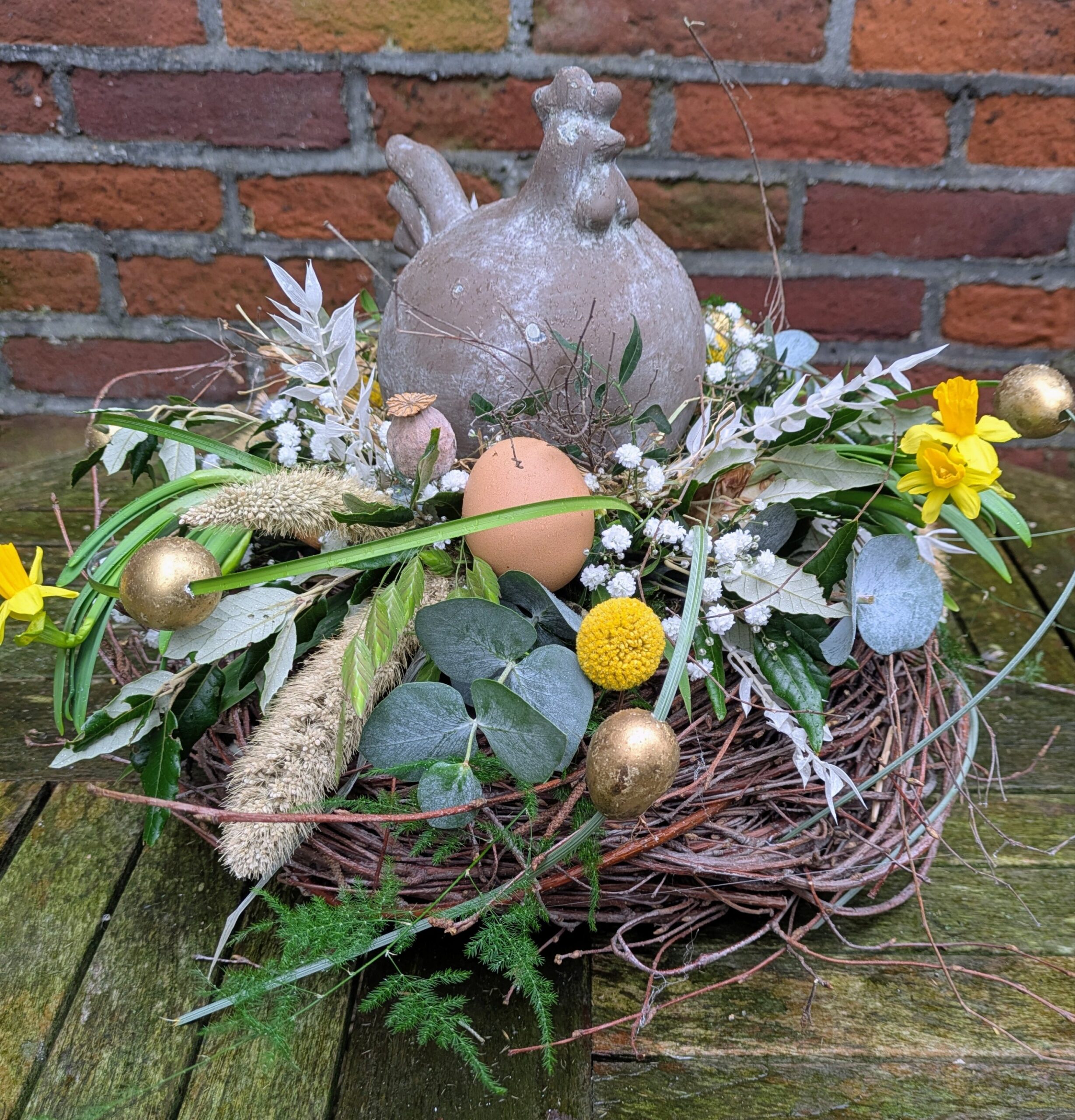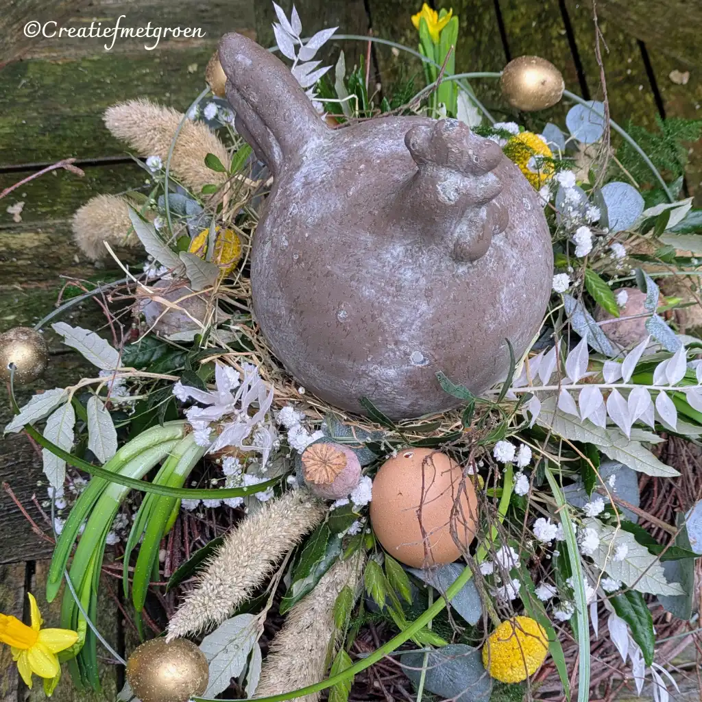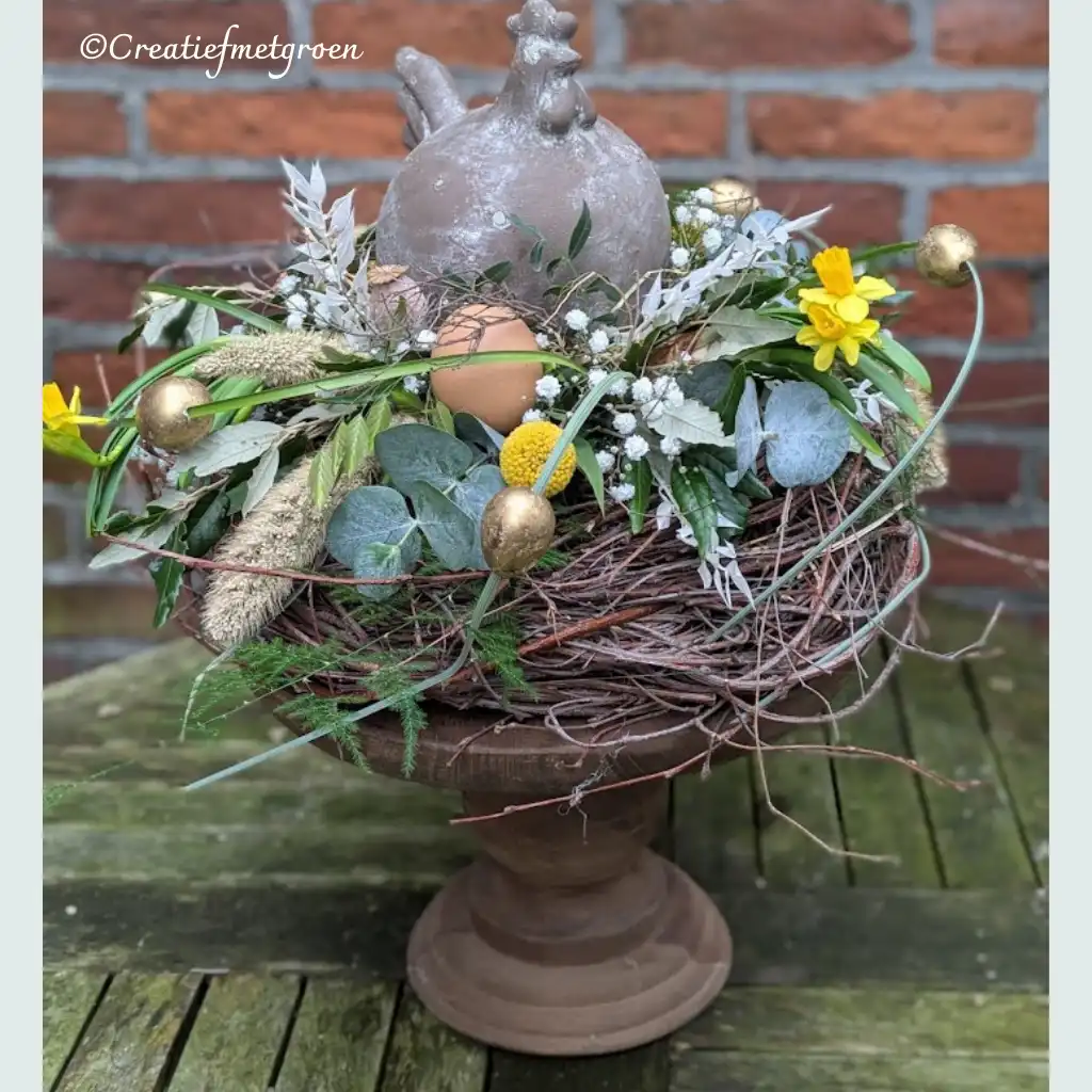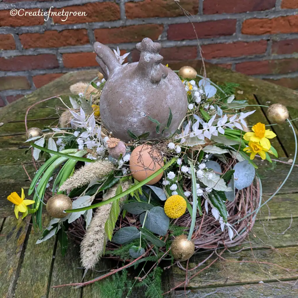 Soms zegt een stuk gewoon alles… En dit is er zo één! Maak kennis met ons nieuwe DIY pakket “De Kip met de Gouden Eieren” 🐔✨ Geweldig leuk als blikvanger tijdens het voorjaar of Pasen! Een sfeervol en landelijk voorjaarsstuk op een natuurlijke kransbasis van gevlochten takken. In het midden pronkt een prachtige, robuuste kip in aardetint, omringd door een speels nest van stro, natuurlijke eieren en subtiele gouden accenten.