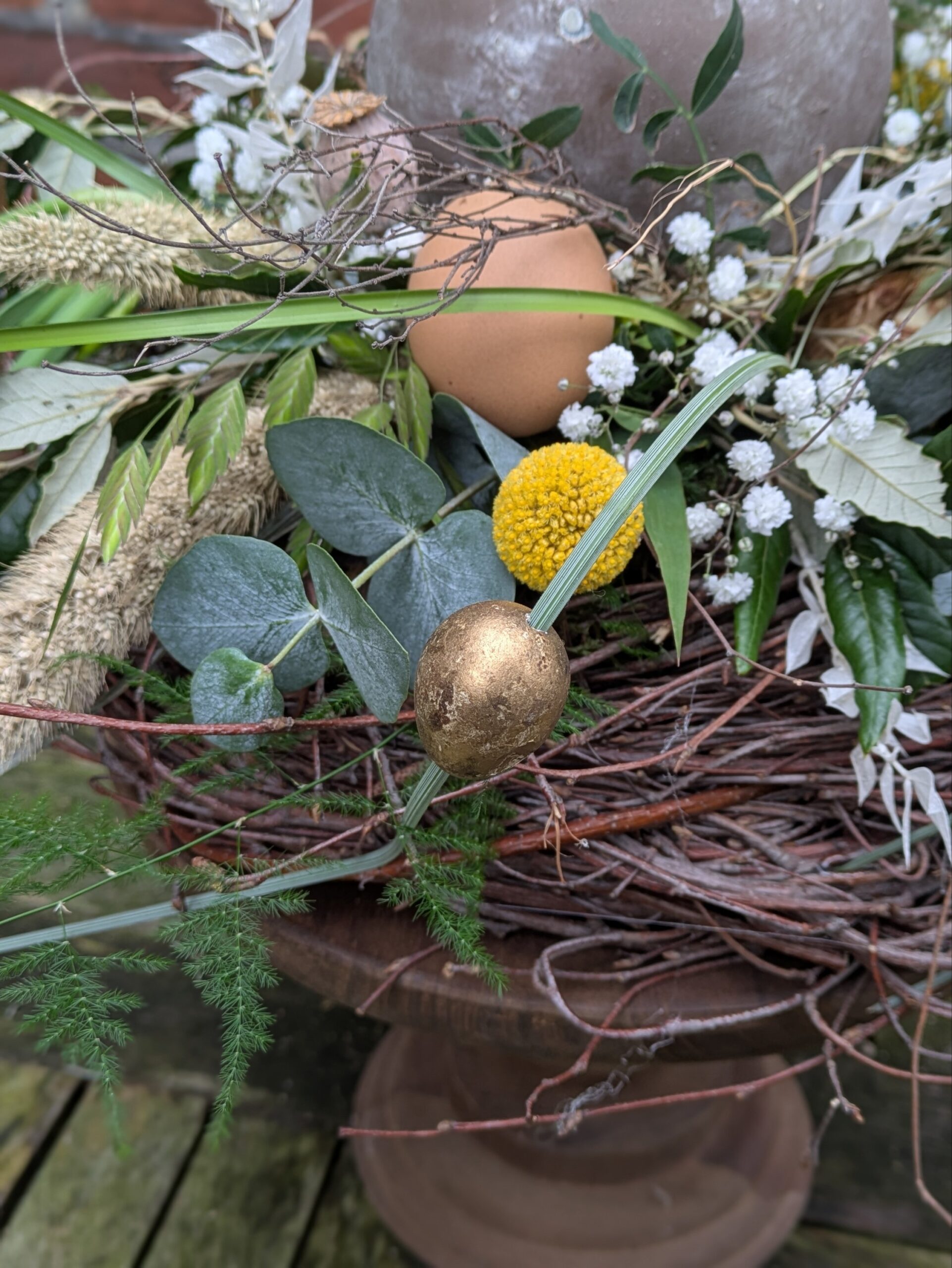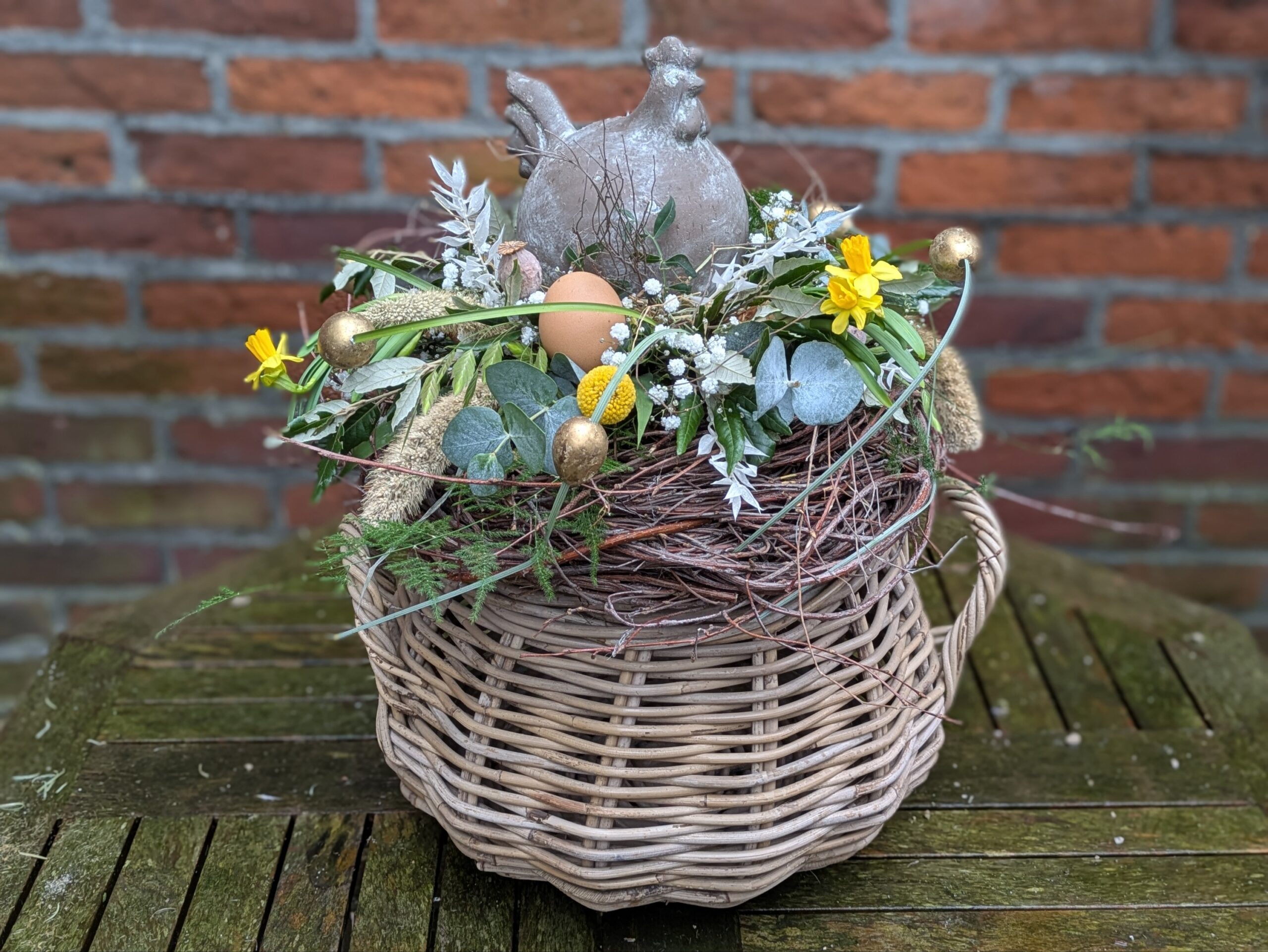 Tussen het groen groeien frisse narcissenbolletjes die het stuk een levendige, zonnige uitstraling geven. Zacht gipskruid, eucalyptus en diverse natuurlijke materialen geven het geheel een rijke, landelijke uitstraling.