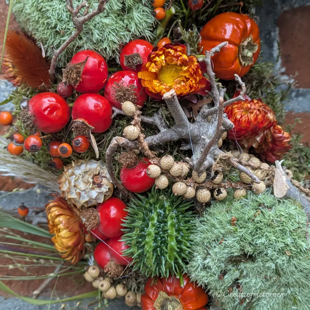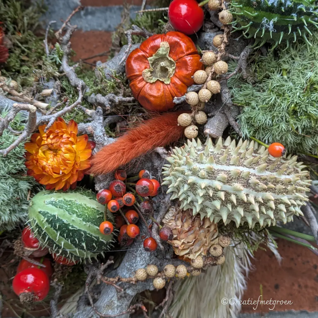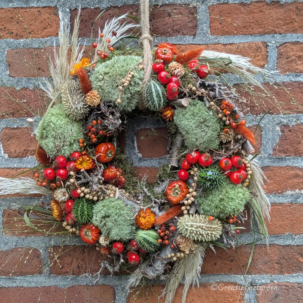 Breng de warmte van het najaar naar je voordeur met deze sfeervolle Deurkrans Herfst Geluk! Met haar rijke tinten, natuurlijke materialen en speelse besjes is ze een echte blikvanger — en een hartelijk welkom voor iedereen die aanbelt. Deze krans is met zorg samengesteld uit gedroogde materialen zoals mos, sierappeltjes, rozenbottels, pompoentjes en andere seizoenschatten. De krans blijk lang mooi, zodat je er het hele najaar van kunt genieten 🍁