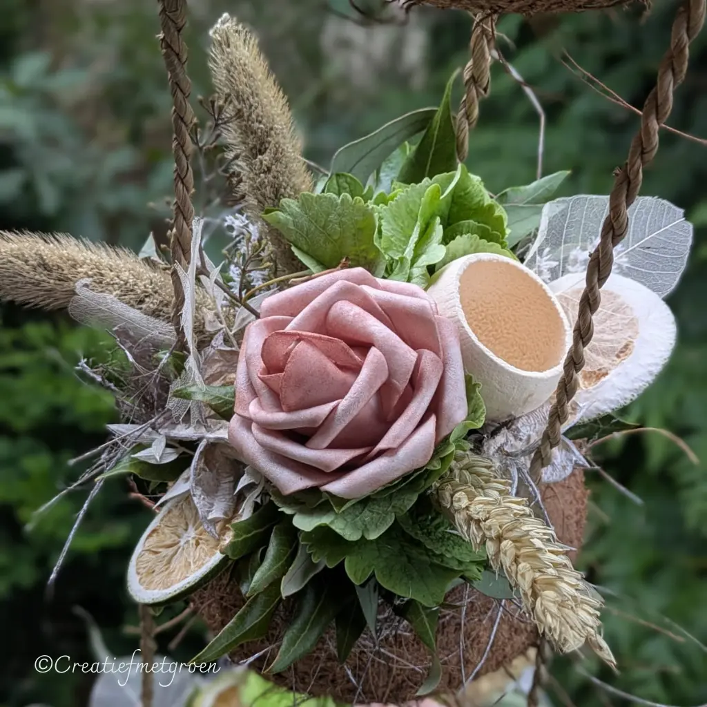 Het groen droogt mooi in samen met de andere droogmaterialen. Het resultaat is een romantische bloemenhanger die