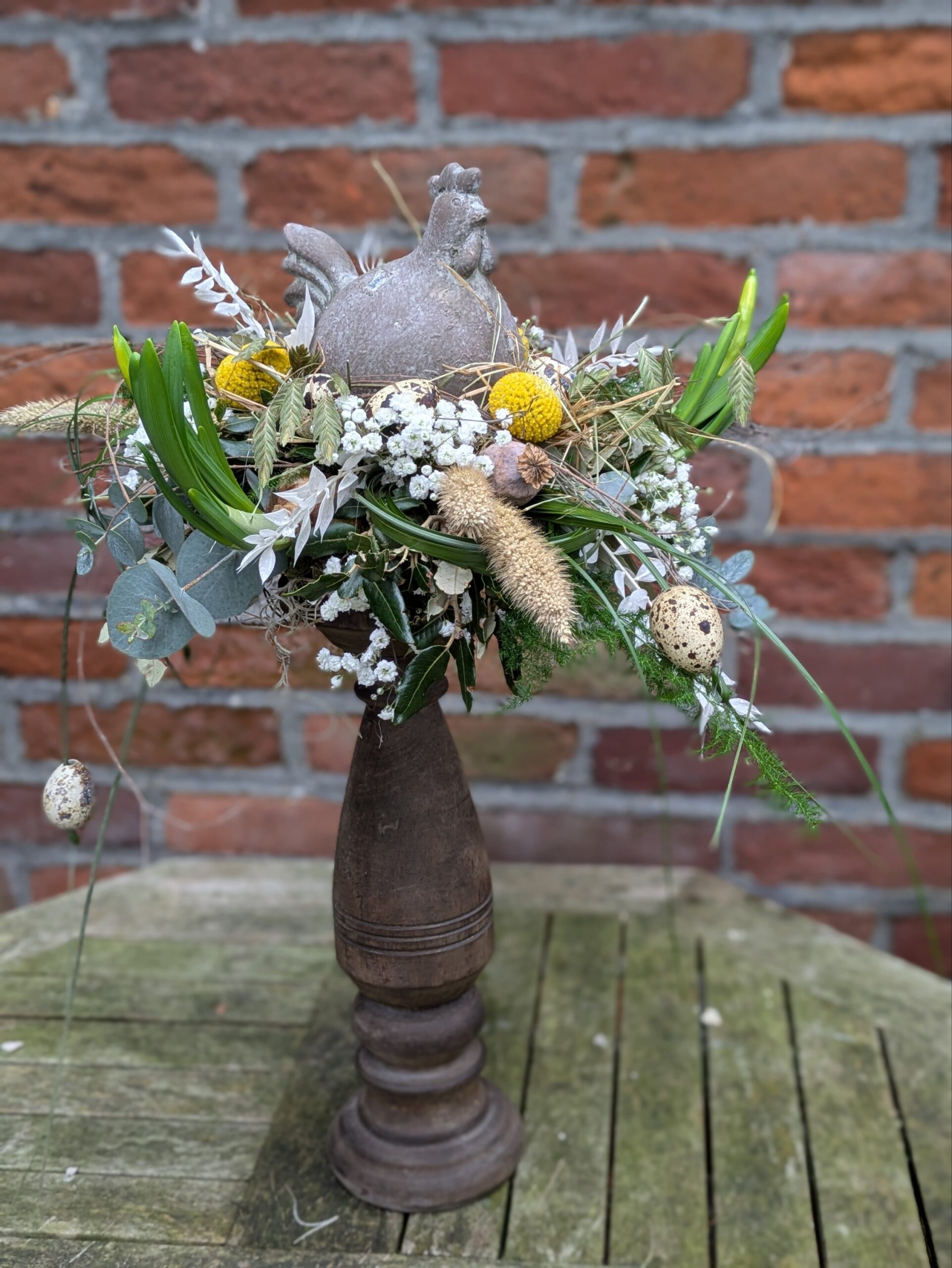 De kwarteleitjes en de nestachtige materialen geven het stuk die gezellige voorjaars sfeer.