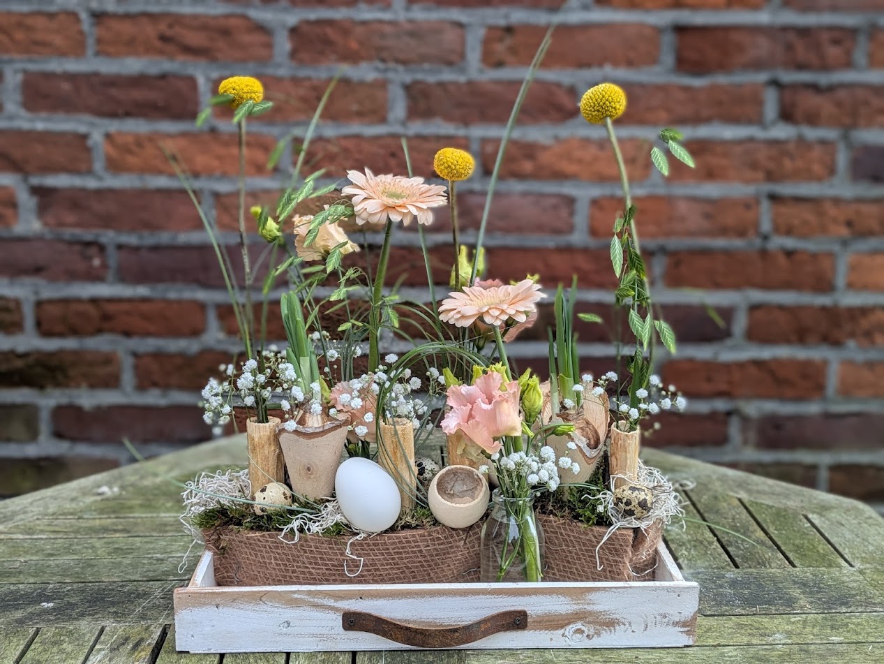 Wat dit ontwerp extra bijzonder maakt, is de slimme opbouw. Je verwisselt eenvoudig je bloemen en bolletjes in een handomdraai. Deze creatie pas je daardoor eenvoudig aan aan jouw smaak en het seizoen. De basis blijft — jij geeft er telkens opnieuw een andere sfeer aan. Overdag fris en licht. ’s Avonds sfeervol en warm.