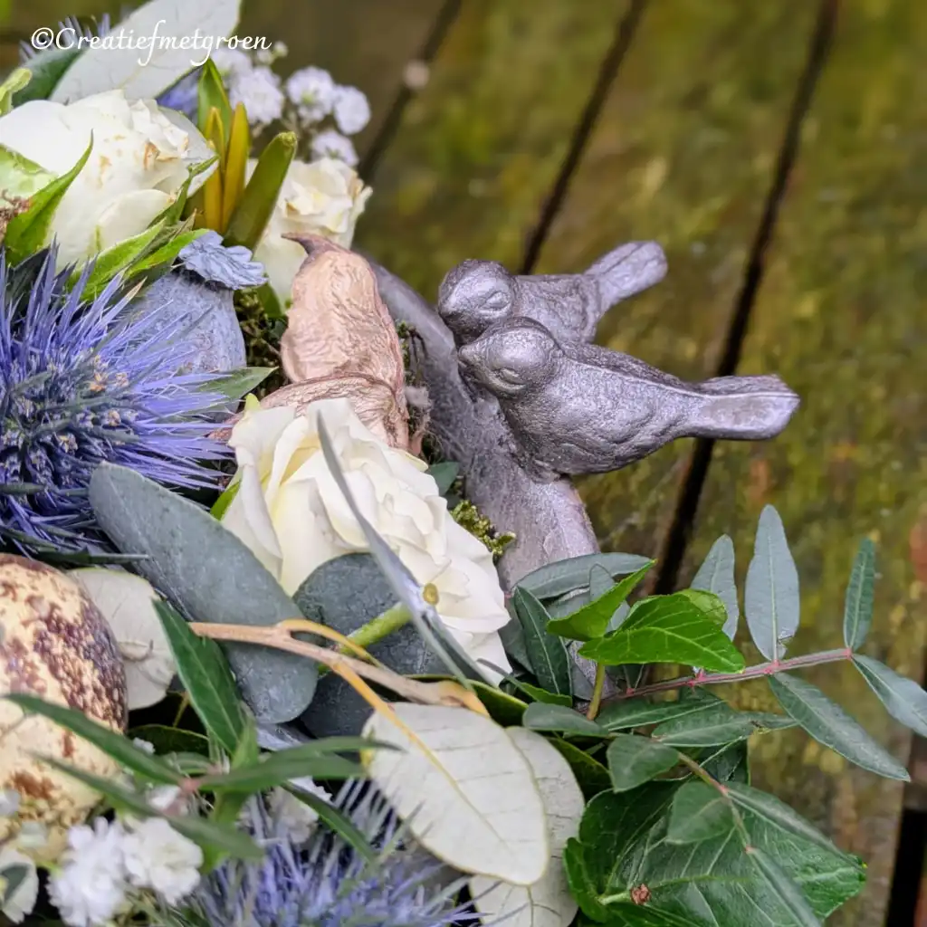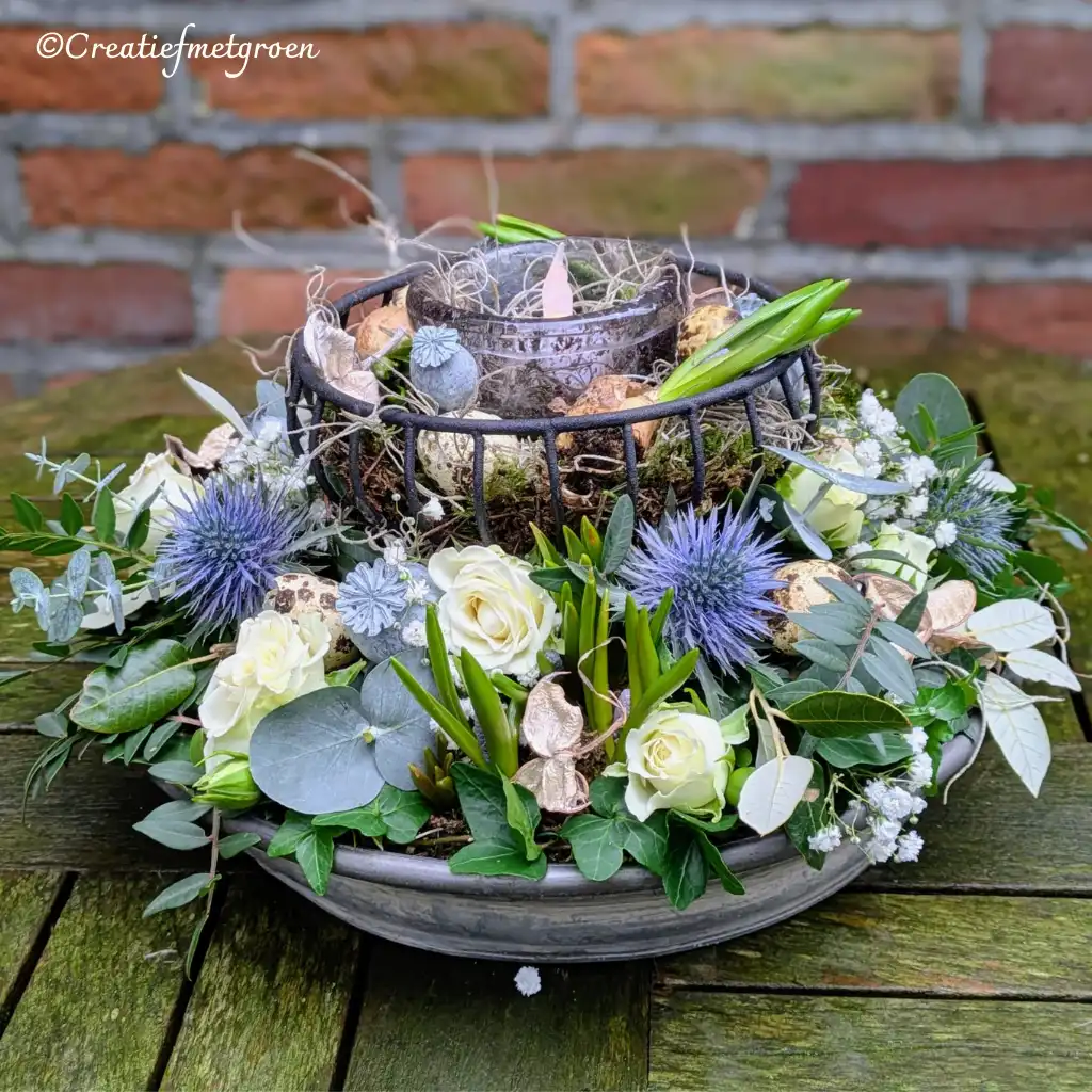 Met het DIY bloemschik pakket Lief Lente Lichtje maak je zelf een sfeervol voorjaarsstuk met een warme en natuurlijke uitstraling. De basis is een stoere zinken schaal met 2 lieve vogeltjes op de rand. In het midden staat een glazen potje met waxinelichtje, dat ’s avonds zorgt voor een zacht en gezellig licht. Rondom verwerk je frisse blauwe druifjes, roosjes, distels en groen. De materialen zijn zorgvuldig gekozen omdat ze mooi indrogen en daardoor langdurig decoratief blijven.