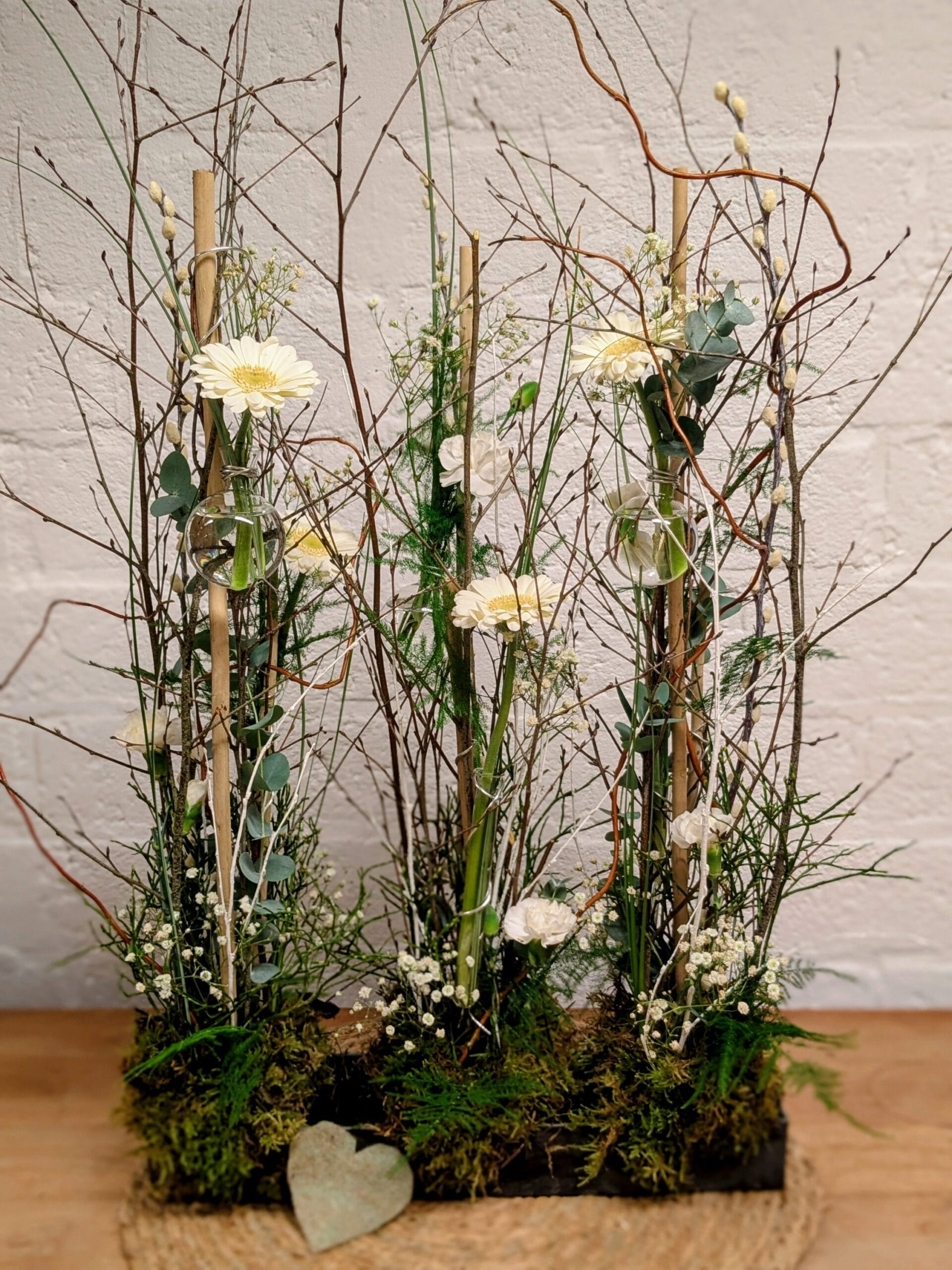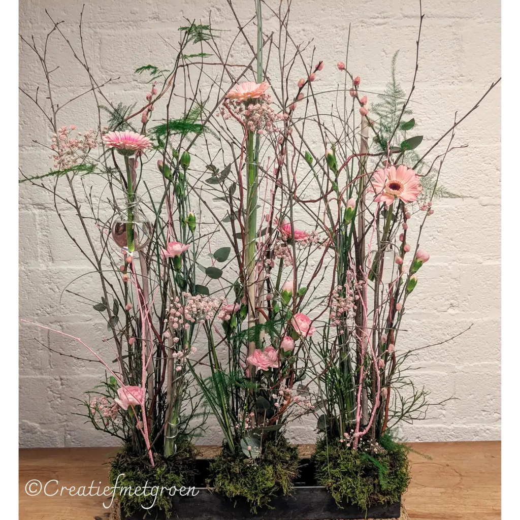✔ Alle materialen – van bloemen tot takken, mos en een stevige basis