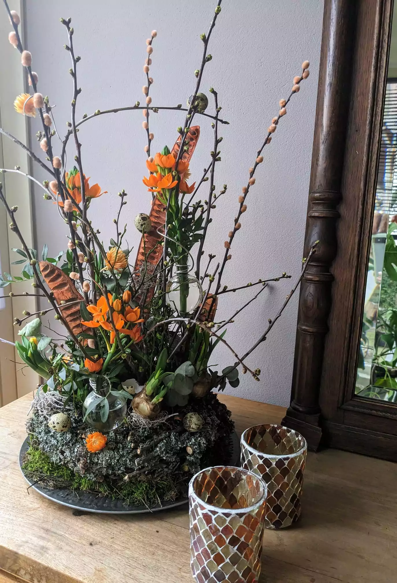Een bijzonder stuk op natuurlijke wijze gestoken. Op een zinken onderbord met een korstmos krans, kersenbloesem, Salix katjes, droogbloemetjes, pistache, eucalyptus , huckle berry, buxus groen, narcissen bolletjes, en glaasjes met Ornithogalum en eitjes.