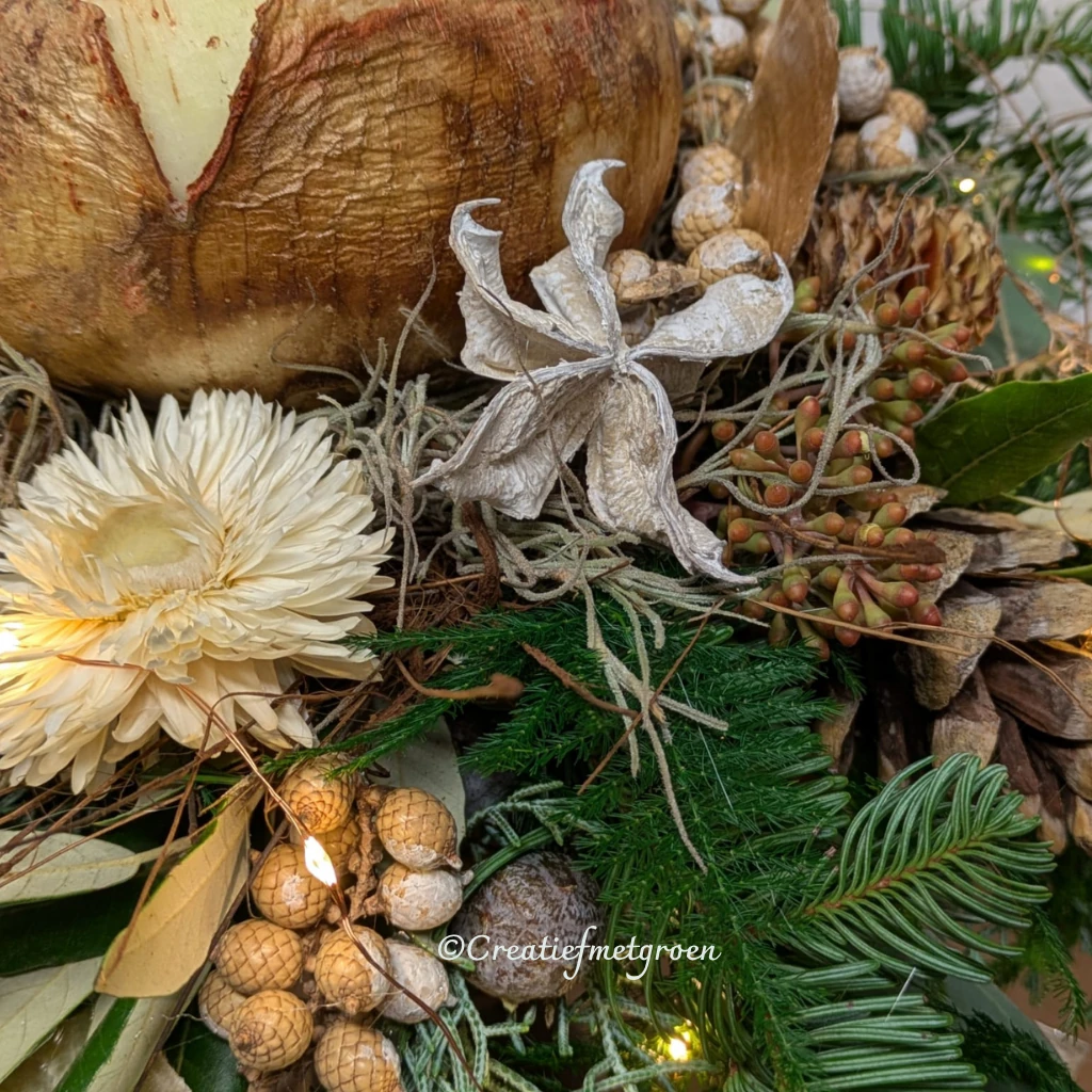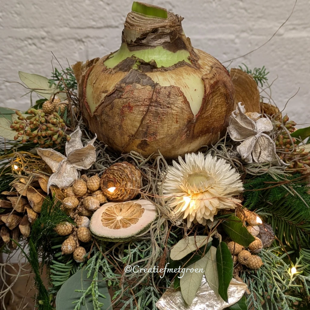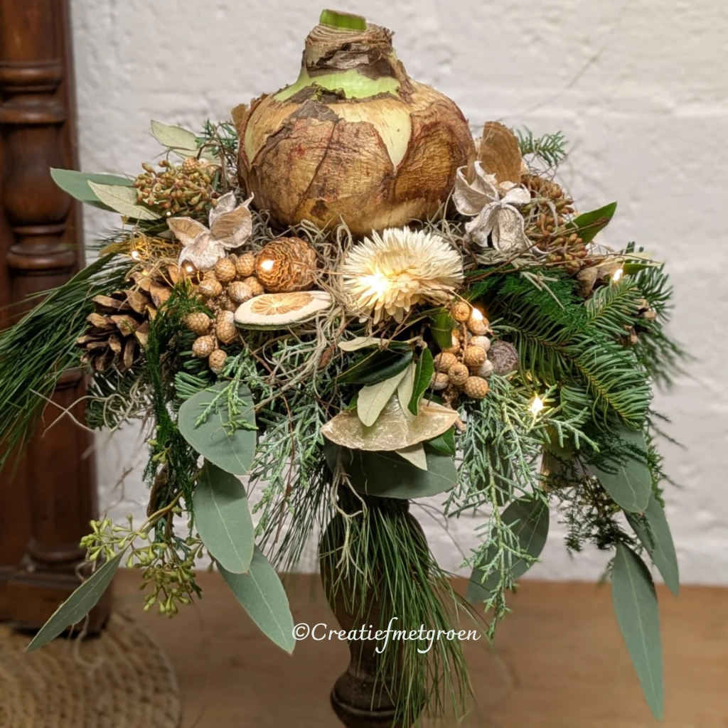 Queen of Winter straalt klassieke luxe uit met een natuurlijke charme. De amaryllisbol van topkwaliteit vormt het middelpunt van dit stijlvolle arrangement, gepresenteerd op een houten voetstuk. Omringd door wintergroen, eucalyptus, dennenappels en een zacht lichtjessnoer brengt dit stuk warmte en sfeer in huis. De materialen zijn van hoogwaardige kwaliteit en drogen prachtig in, waardoor je er nog weken van kunt genieten. 🌿✨